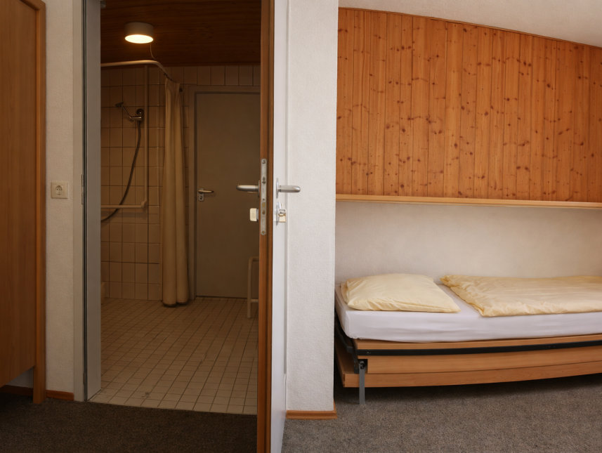 Zwei gleiche Zimmerpaare pro Stock, jedes Zimmerpaar teilt sich ein Bad. In jedem der insgesamt acht Zimmer befinden sich drei Einzelbetten, ein Tisch und ausreichend Platz.