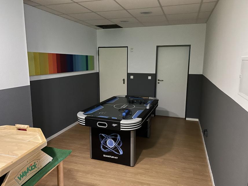 Der kleine Aufenthaltsraum für bis zu 8 Personen beinhaltet Kühlschrank und Teestation. Ebenfalls kann man sich im Speiseraum sowie im Eingangsbereich aufhalten.