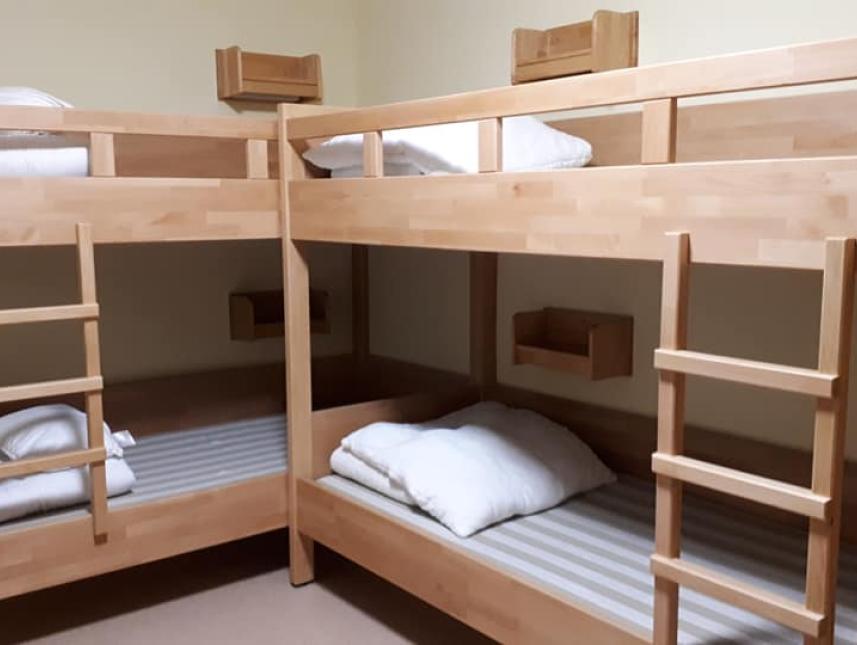 Die Schlafräume sind verteilt über zwei Etagen. In jeder Etage gibt es Toiletten und Duschen. Vorhanden sind Kissen und Decken. Mitzubringen sind 3-teilige Bettwäsche (keine Schlafsäcke) und Handtücher.