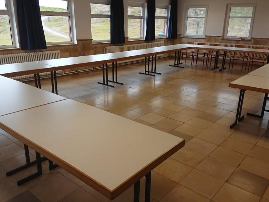 Speisesaal, gr. Gruppenraum im OG (für ca. 60 Personen), gr. Gruppenraum im EG (ca. 30 Personen), zwei kleine Gruppenräume (für je ca. 10 Personen) im EG