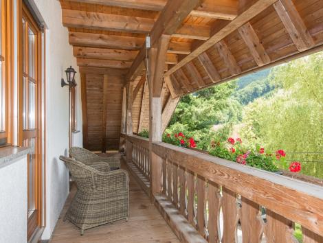 Ferienwohnung im Dachgeschoss des Leibgedinghauses. Die Wohnung ist 70 m² groß. Sie hat ein geräumiges Schlafzimmer mit einem Doppelbett und einem Einzelbett (1,40 x 2m), ein kleines Zimmer mit einem Kinderbett, ein Bad mit Dusche und WC. Außerdem verfügt Sie über einen geräumigen Wohn- und Essbereich mit einer Leseecke und einer komfortablen, ausziehbaren Schlafcouch. Vom Dachfenster des Schlafzimmers haben Sie einen herrlichen Blick ins Harmersbachtal bis zur Burgruine Geroldseck. Die Wohnung befindet sich im Dachgeschoss des Leibgedinghauses. Sie ist über 2 Treppen erreichbar und somit nicht barrierefrei. Die Wohnung verfügt über einen Balkon (2,5 x 7,5m groß) mit Blick ins Grüne.