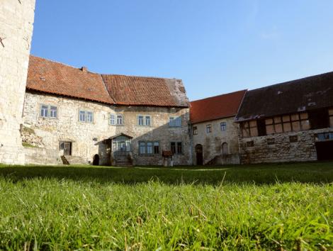 Imposante mittelalterliche Burganlage mit besonderer Atmosphäre am Rande eines Naturschutzgebietes - fernab der Welt, hoch über der Landschaft. Eseltreiberhäuser mit Sackflickstube in der Vorburg, Weißes Haus und Graues Haus im Außengelände, Grünland und Streuobstwiese.