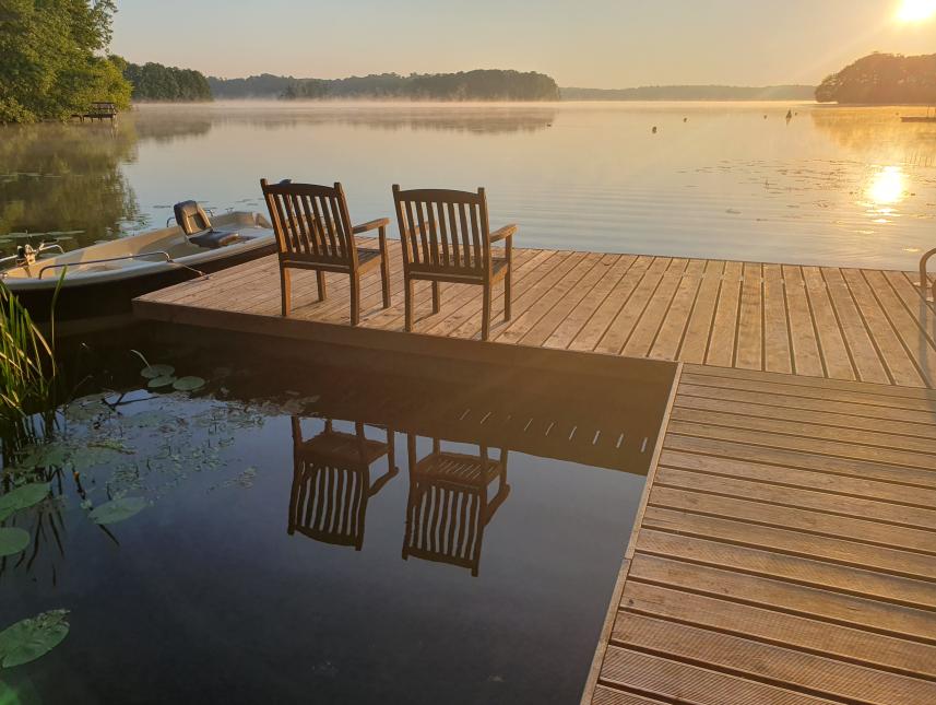 Wir haben unseren eigenen Steg auf dem Grundstück und vermieten Boote.
