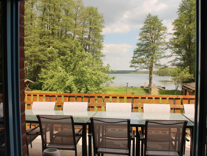 Etwa 20 Personen können auf der Terrasse sitzen, essen und den herrlichen Ausblick auf den See genießen, größere Gruppen nach unten in den Garten ausweichen.