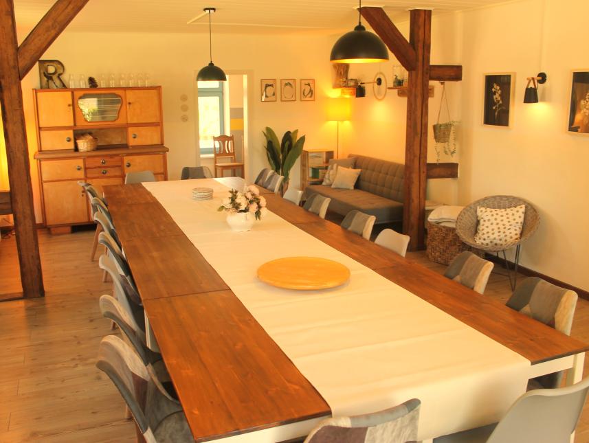 Ein großer Raum mit Couchen lädt zum gemeinsamen Sitzen ein, Der noch größere "Seminarraum" hat 9 Tische und 25 Stühle. Dort kann man gemütlich essen und spielen.
