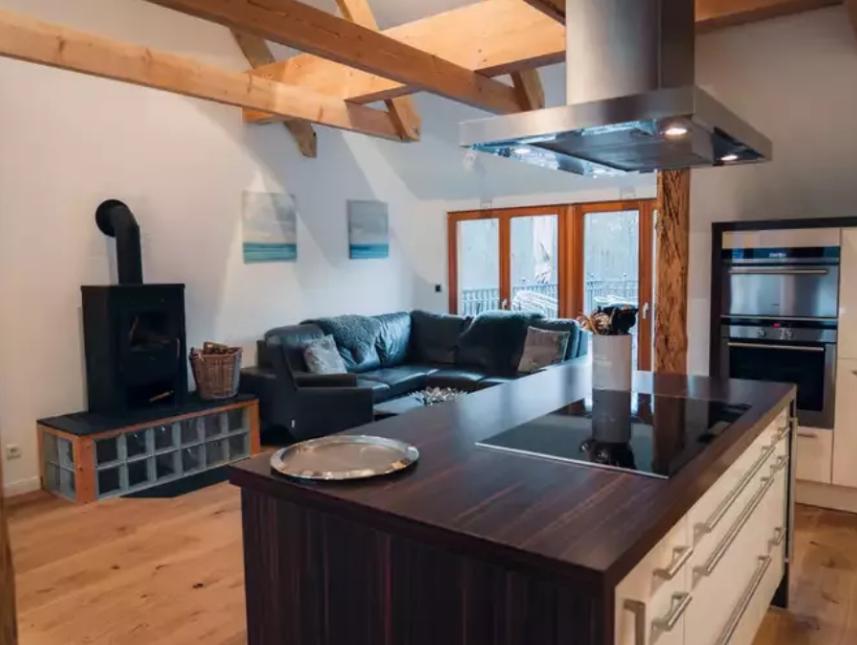 Schöner großer Aufenthaltsraum mit Esstafel, Fußbodenheizung, Sitzecke und Kamin, verbunden mit der offenen guteingerichteten Küche.Der Raum ist ca. 60 m²groß.