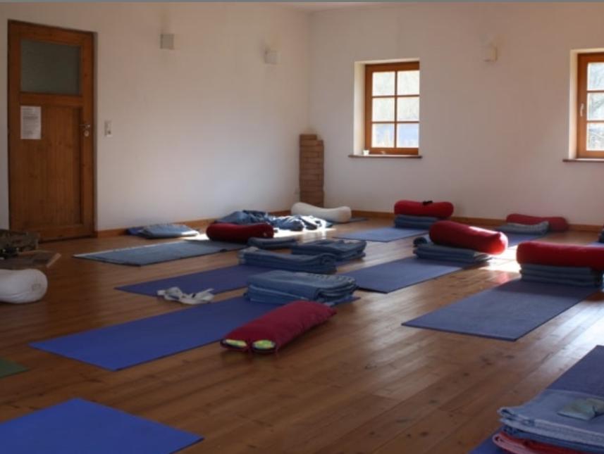 Yogamatten und Meditationskissen sowie Klappstühle zur Verfügung.Bei Bedarf Tische. Ebenfalls 60 m² groß.