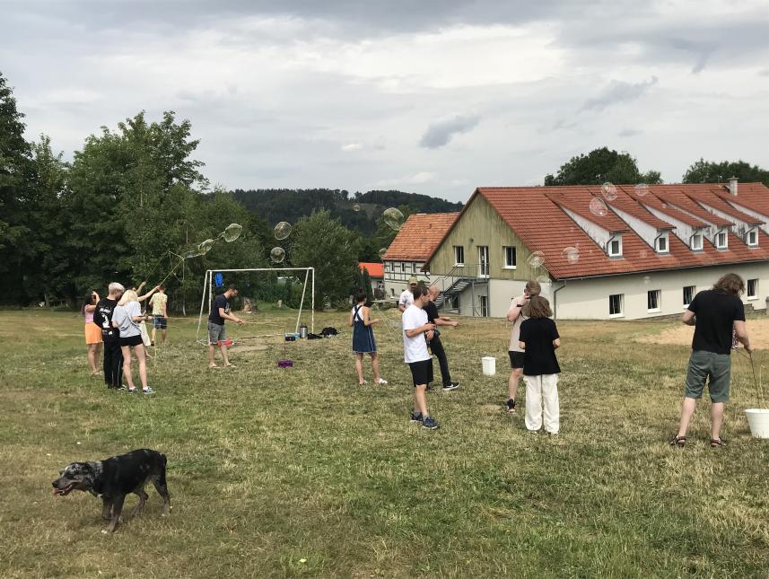 Unser Haus bietet einen großen Outdoorbereich mit Fußball-, Basketball-, Beachvolleyball- und Tischtennisplätzen sowie Grünflächen - ideal für Seminare unter freiem Himmel, erlebnispädagogische Angebote oder einfach zum Spielen, Herumtoben oder Relaxen. Ein Grill- und Lagerfeuerplatz, eine kleine Quelle und ein schöner Naturteich direkt hinter dem Haus laden zu gemütlichen Stunden ein. Im Sommer können die Mahlzeiten auch auf der Terrasse am Speisesaal eingenommen werden.