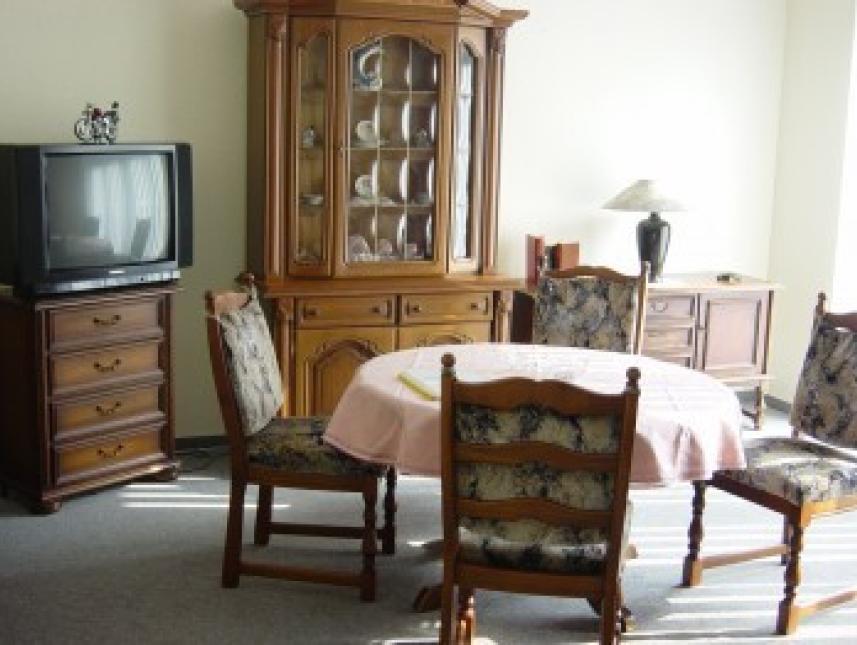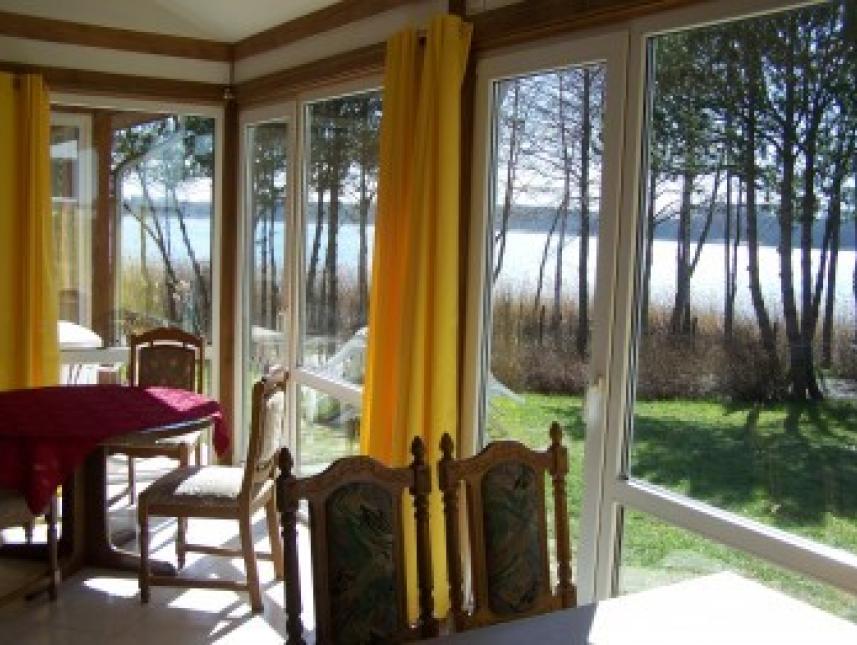 Das Ferienhaus hat Terrasse, Wintergarten, Diele, Küche, Wohnz., 4 Schlafz. und 3 Bäder. Der Wintergarten ist lichtdurchflutet und die Panoramafenster zeigen nach Süden. Der Blick auf den See wird umrahmt von viel Grün. Im Wohnzimmer stehen eine Couch und 2 Sessel, Nußbaummöbel, Esstisch und 4 Stühle.