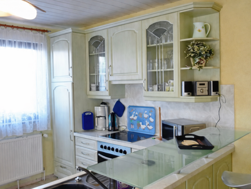In der oberen Etage befinden sich 2 Schlafzimmer, eines mit Balkon, 1 Duschbad mit WC und eine Pentriküche in einem abgeschlossenen Wohnbereich. Ebenfalls vom kleinen Flur an der Eingangstür kommt man durch eine zweite Tür in die Diele, von wo aus eine der 4 Türen in das Bad mit Wanne, Runddusche, Waschtisch und WC, eine Zweite ins Wohnzimmer mit Couch, Sessel, einer zweiten Sitzgruppe und einem großem Fenster mit Terrassentür führt. Über eine Wendeltreppe gelangt man in das Schlafzimmer im Erdgeschoß. Durch die dritte Tür betritt man die große Küche mit EBK, Glastresen mit Barhockern und einem Eßtisch. Von der Küche, über den lichtdurchfluteten Wintergarten und vom Wohnzimmer erreicht man direkt, durch die Terrassentüren, die 20 m² große Terrasse. Hinter der vierten Tür der Diele liegt das vierte Schlafzimmer. Auf der Terrasse und im Gartenbereich, mit unverbauten Blick zum Wald und saftigen Wiesen, befinden sich Gartenmöbel, Grill und Sonnenschirme. Eine Tischtennisplatte steht auch zur Verfügung. Der Kukuker Buchenwald ist nur 50 m vom Haus entfernt. Art der Versorgung: