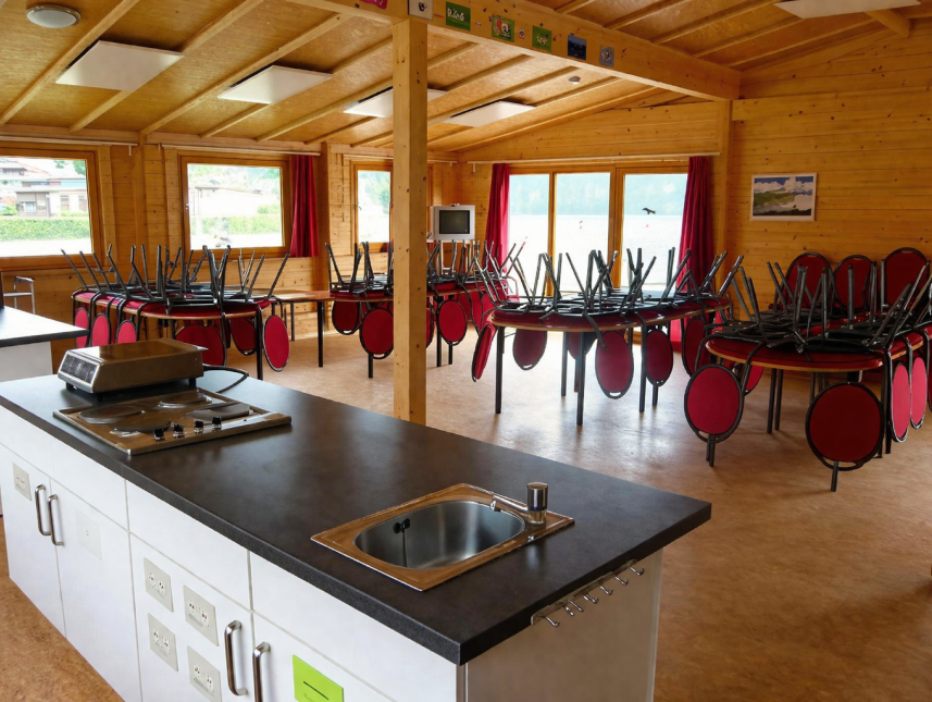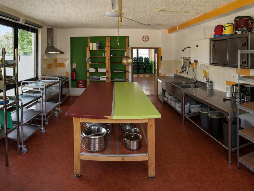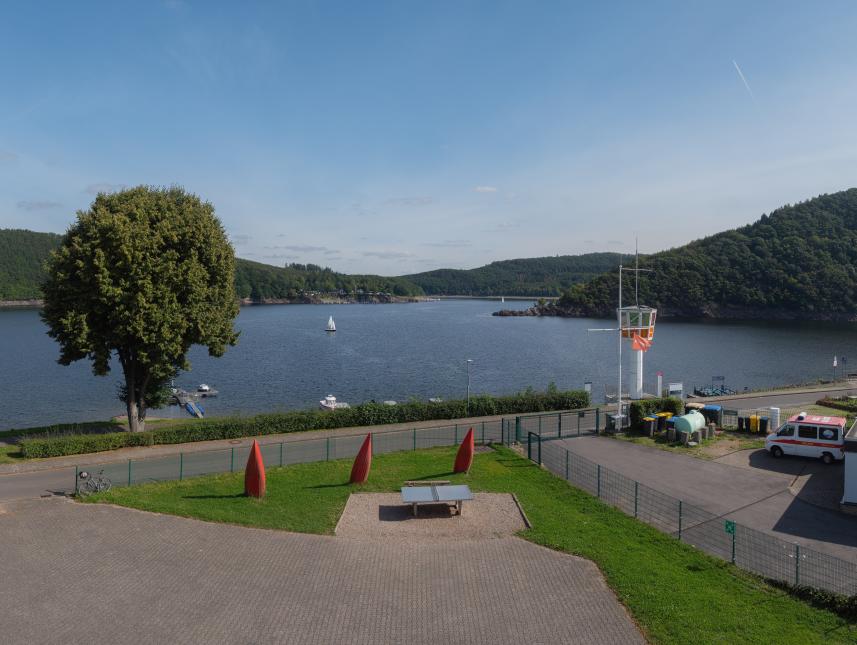 Haus 5, das Gemeinschaftshaus, ist mit einer modernen Selbstversorgerküche für bis zu 60 Personen ausgestattet. Zwei große Spülbecken, eine Gastrospülmaschine, ein großer Backofen und ausreichend Herdplatten machen das gemeinschaftliche Kochen zu einem bequemen Gruppenvergnügen. Für hoffentlich viel Zeit draußen stehen ein großer Grill, eine Feuerschale und ausreichend Bänke und Tische zur Verfügung. Von der Terrasse des Gemeinschaftshauses blickt man direkt auf den Rursee.Ort & Lage