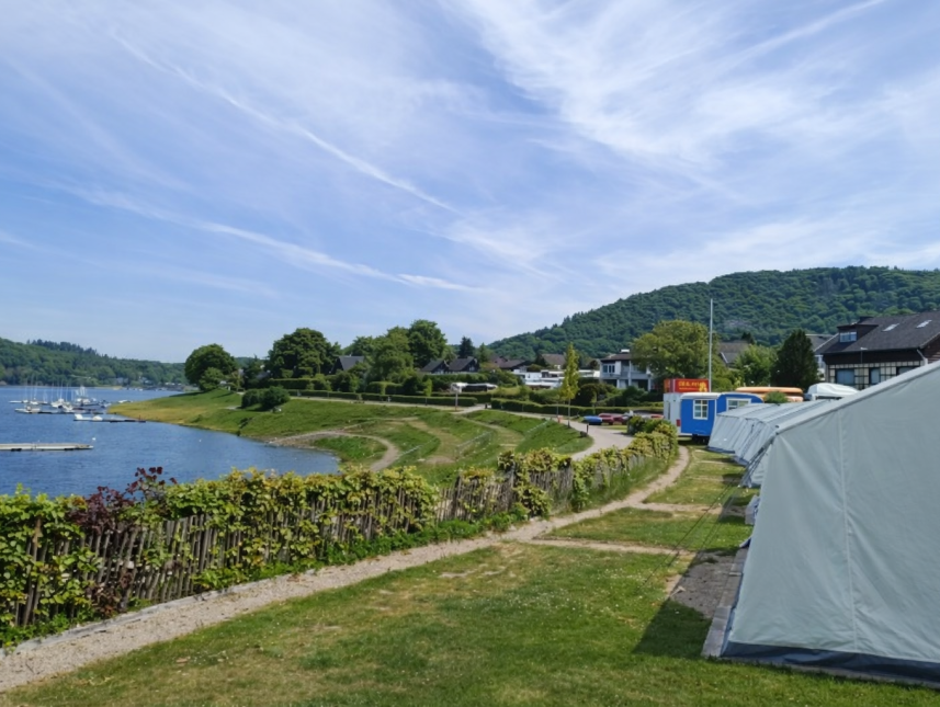Die Zeltdorf steht in erster Reihe mit Blick auf den Rursee. Gruppen können das Küchenzelt (5x9 m) mit Holzfussboden und zusätzlicher Küchenausstattung nutzen.