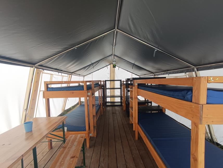 Nabedi-Zeltdorf: 4 Zelte a 8 Betten, 1 Zelt mit 4 Betten, 2 Bauwagen