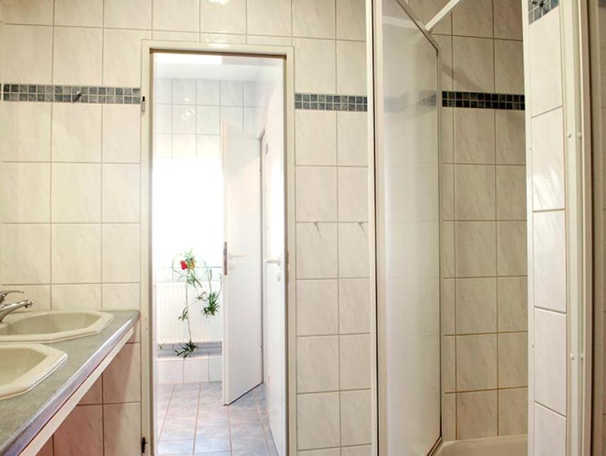 Separater Wohnbereich, der auch für Rollstuhlfahrer geeignet ist, mit 2 Schlafräumen und 5 Betten, sowie Duschbad und WC, 6 Schlafräume mit bis zu 15 Betten, zwei Sanitärbereiche, getrennt für Damen und Herren, mit jeweils 2 Duschen, 3 Waschbecken und 2 Toiletten.