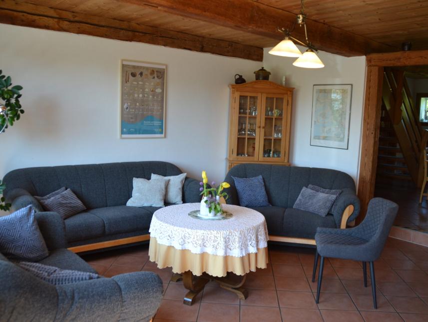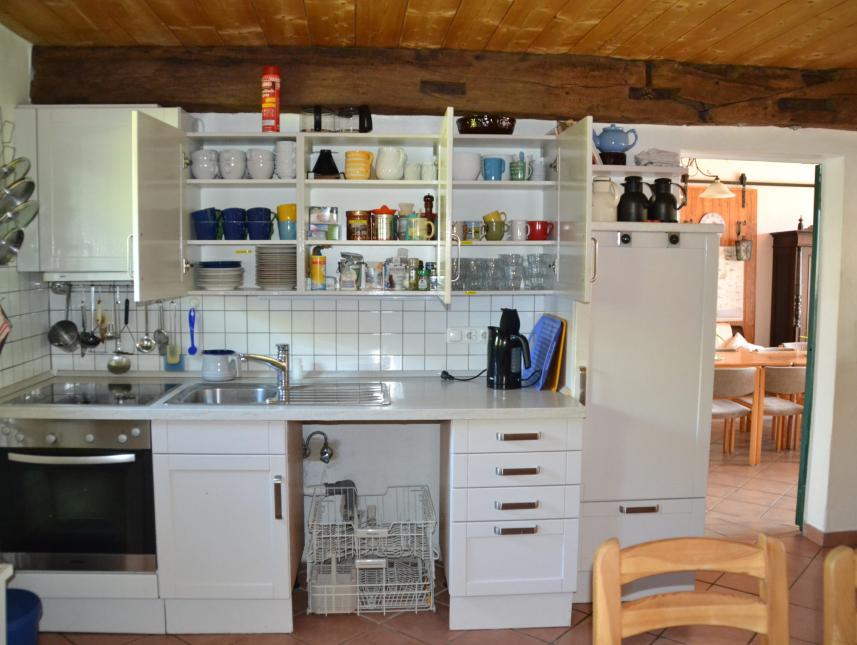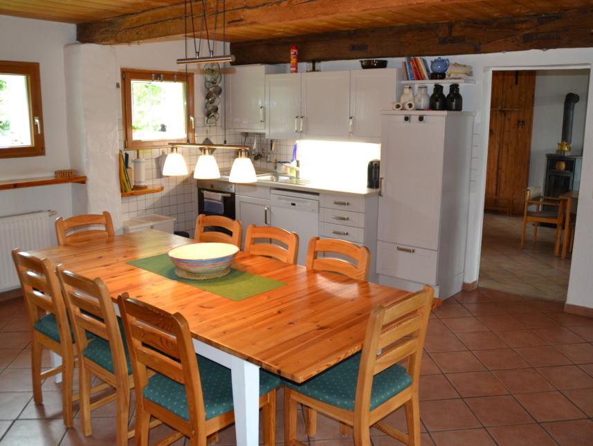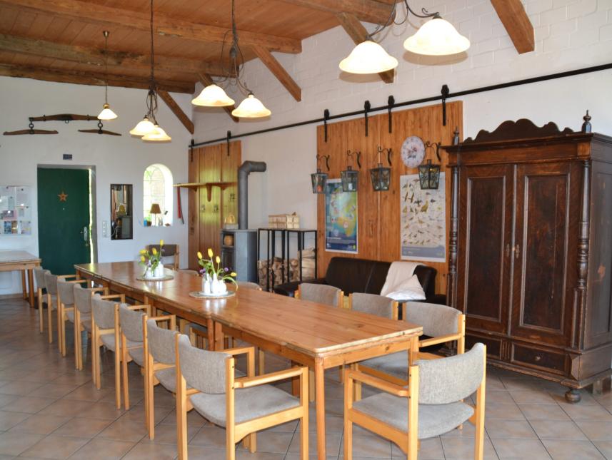 Wohnzimmer mit alten Balken, neuer Einrichtung, Fernseher und Telefon (auf Wunsch kann der Fernseher entfernt werden). Küche mit alten Balken und Stallfenstern, mit Sitzgruppe, Einbauküche und Geschirrspüler, separates Duschbad mit WC und Waschmaschine (z.B. für Betreuer), 60 qm Diele als Speise-, Aufenthalts- und Vortragsraum, mit einer Sitzgruppe (bis 20 Personen, großer Kühlschrank, Kaminofen und einer breiten Dielentür zur Terrasse.