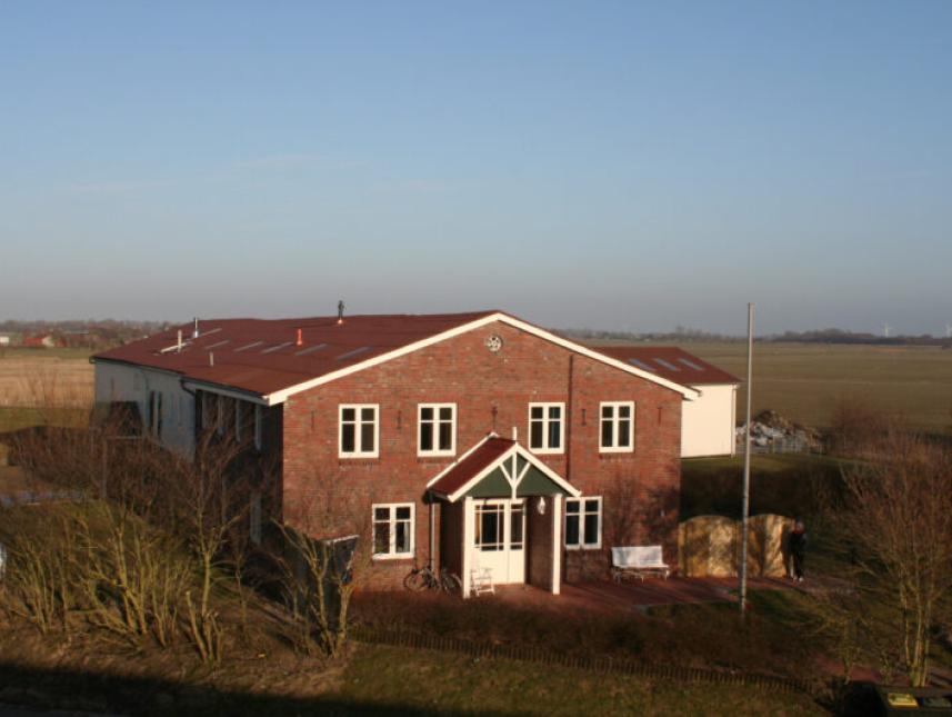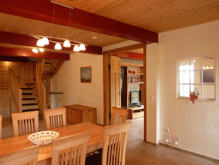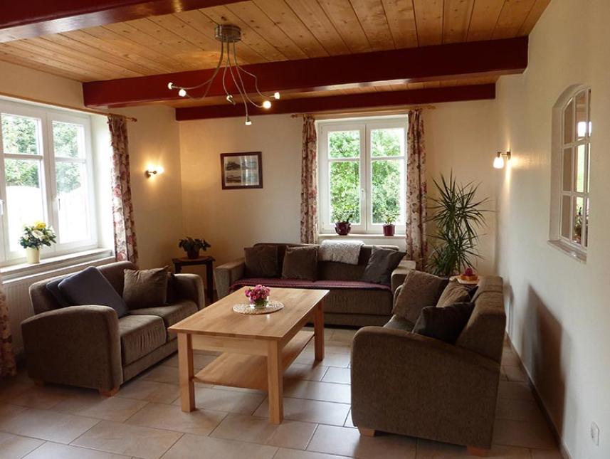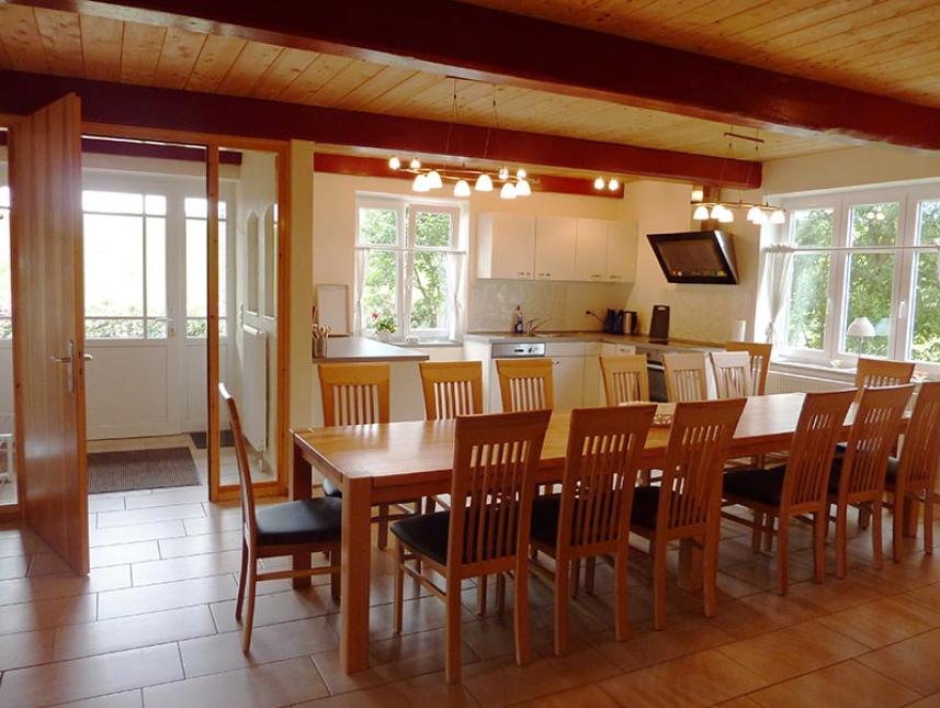 Wohnzimmer mit alten Balken und einer alten Flügeltür, neue Möbel, ein Fernseher mit direktem Zugang zur Südterrasse. Küche mit Einbauküche, großem Herd, 2 Kühlschränken mit Gefrierfach, Sitzgruppe, Mikrowelle und Geschirrspüler2 Schlafräume, für insgesamt bis zu 4 Personen und ein großzügiges Duschbad mit Waschmaschine und Wäschetrockner (Schlafraum, Bad und der gesamte Wohnbereich sind mit dem Rollstuhl befahrbar). 7 Schlafräume mit insgesamt bis zu 12 Schlafplätzen zwei Sanitärbereiche, getrennt für Damen und Herren, mit jeweils 2 Duschen, 3 Waschbecken und zwei Toiletten.