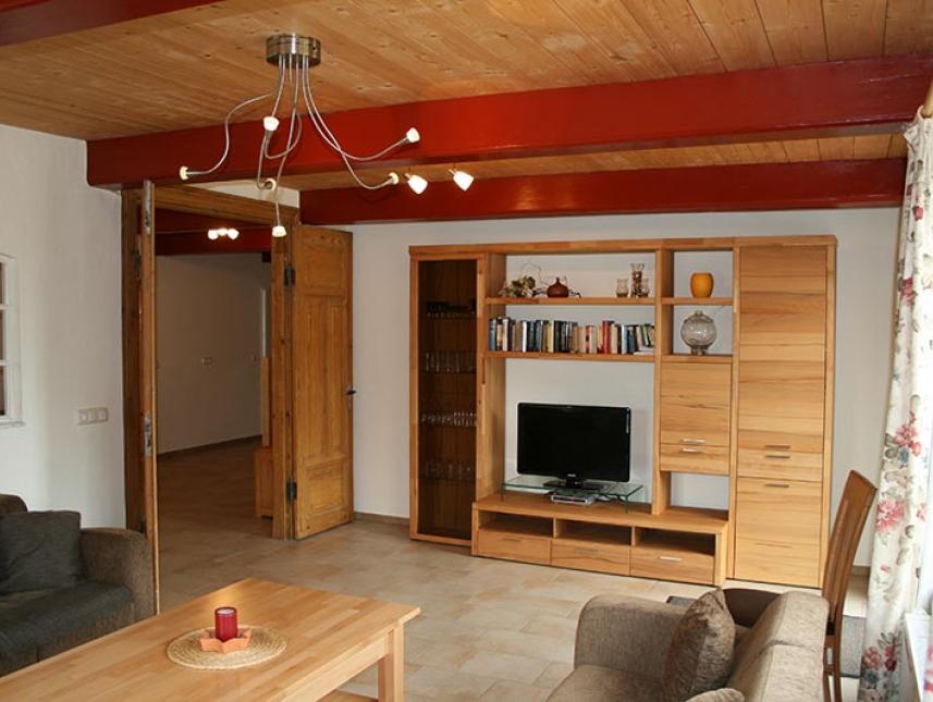 Wohnzimmer mit alten Balken und einer alten Flügeltür