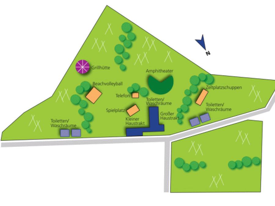 Auf dem Gelände:Spielwiese, Kinderspielplatz ,Kleinspielfeld (Fußball u. Basketball) Lagerfeuerplatz, Grillplatz