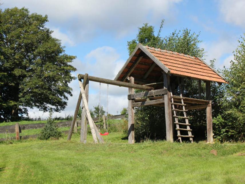 2 ha großes Grundstück mit Spielplatz, Grillplatz, zwei Gartenlauben und eine Liegewiese zum Relaxen. Barierefrei.