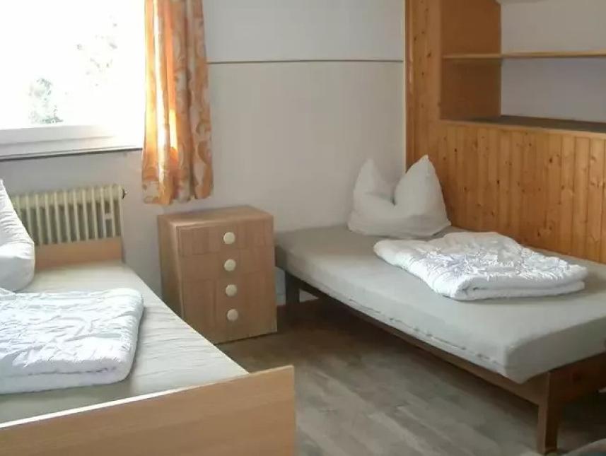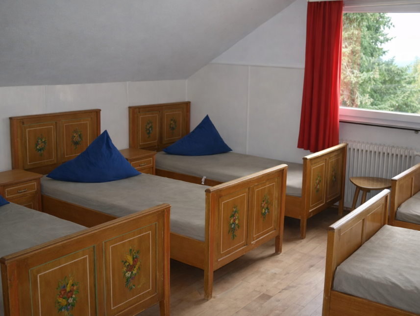 Zimmer: 4 EZ, 3 DZ, 1 Drei-Bett-Zi., 8 MBZ mit 4-8 Betten (alle ohne D/WC), 1x 6-Bett-Zi. mit WC und Waschbecken, einfache Bauernmöbel, Stahlrohrstockbetten, Holzboden