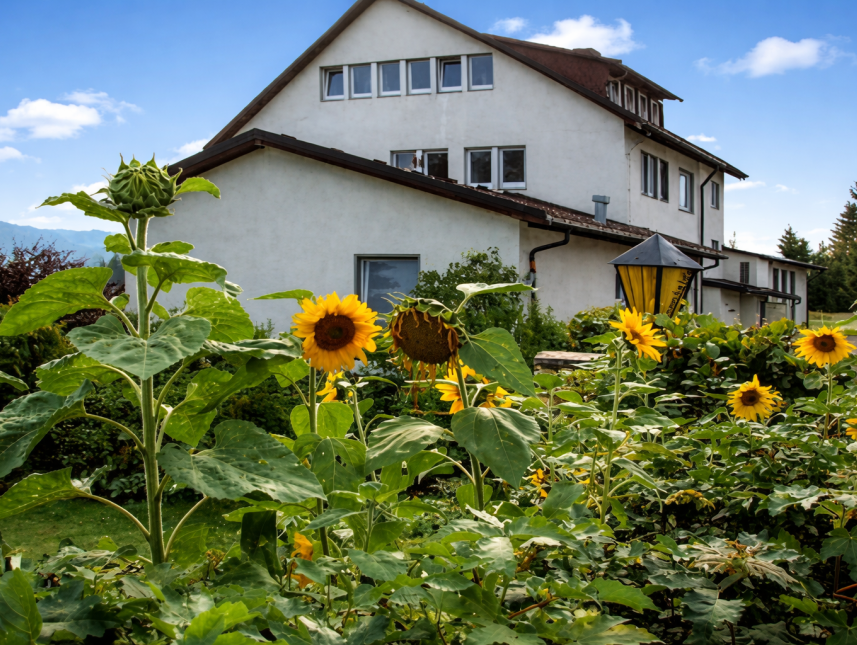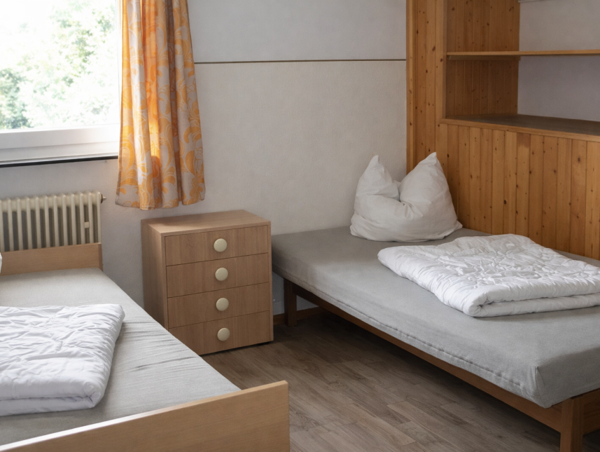 Das Haus Sonnhalde liegt am Waldrand an einem Südhang im südlichen Schwarzwald, nahe der Wutachschlucht mit freiem Blick zum Feldberg. Ruhe, Natur und familiäre Atmosphäre, bei flexibler Raumnutzung machen das vom Stil der 50-er Jahre geprägte Haus für unterschiedliche Gruppen interessant. Ein großer Speiseraum kann mittels Trennwänden unterschiedliche Verwendung finden. Ebenso der teilbare Gymnastikraum der für Musikproben und Körperarbeit gute Voraussetzungen bietet. Zwei angrenzende Räume können variabel als Ess-, Aufenthalts- oder Gruppenräume genutzt werden. Von 3 Schlafbereichen ist ein separater Trakt mit EZ und DZ sowie D/WC für Seminar- und Gruppenleiter vorgesehen. Ansonsten überwiegen einfach ausgestattete Mehrbettzimmer. Eine großzügige Südterrasse sowie die Spiel- und Freizeitwiese und großer Hofplatz bieten vielerlei Möglichkeiten auf dem 50ar Grundstück.
