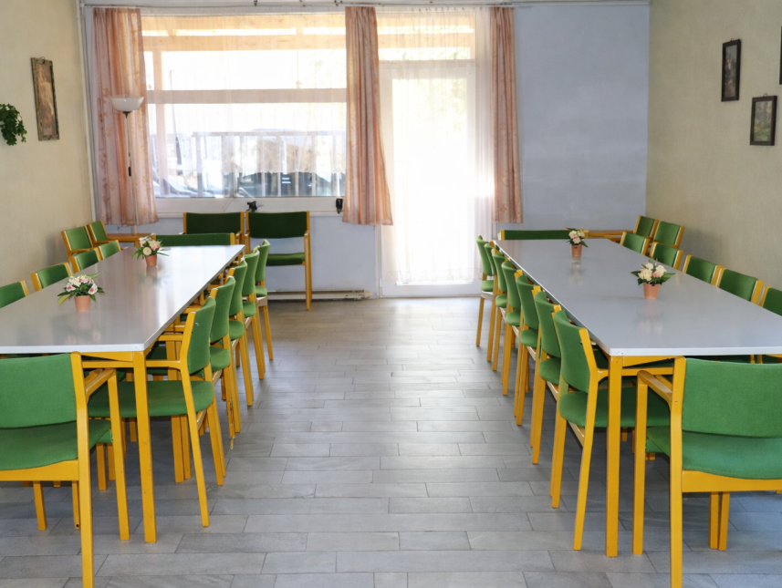 Der kleine Seminarraum ist mit 5 Tischen und 30 Stühlen bestuhlt. Im großen Seminarraum befinden sich 8 Tische und 40 Stühle, 2 Couchen und 4 Sessel, 2 Couchtische u. 1 Musikanlage