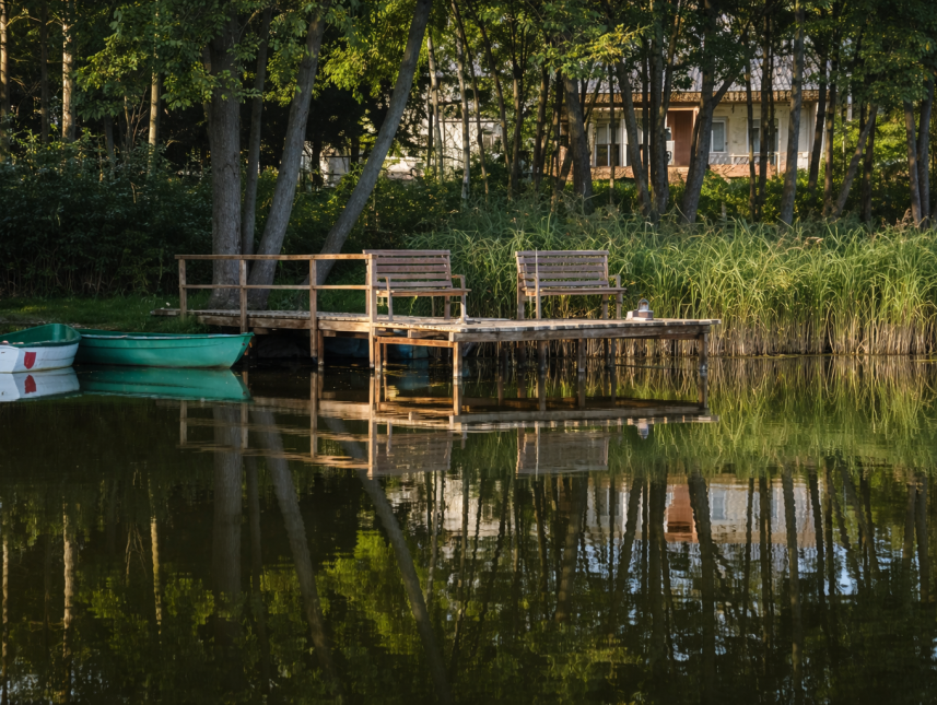 1 Ferienhaus „Bungalow am See“ mit 5 Schlafzimmern, Wintergarten und überdachter Terrasse für bis zu 12 Personen.
