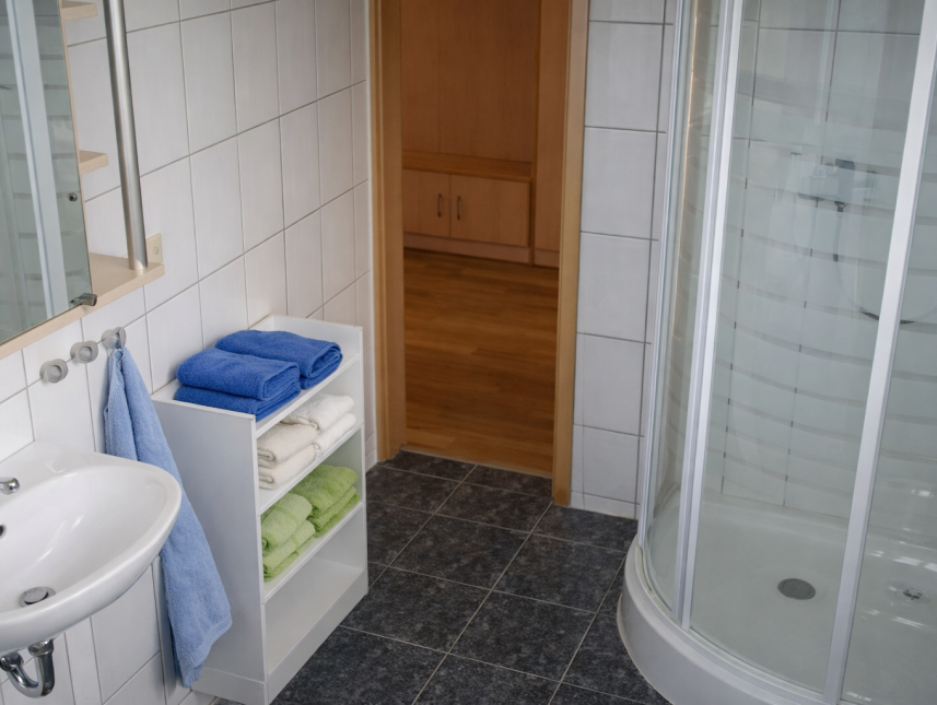 Die 2 Zweibettzimmer mit befahrbarer Dusche im EG sind für 4 Rollstuhlfahrer geeignet.