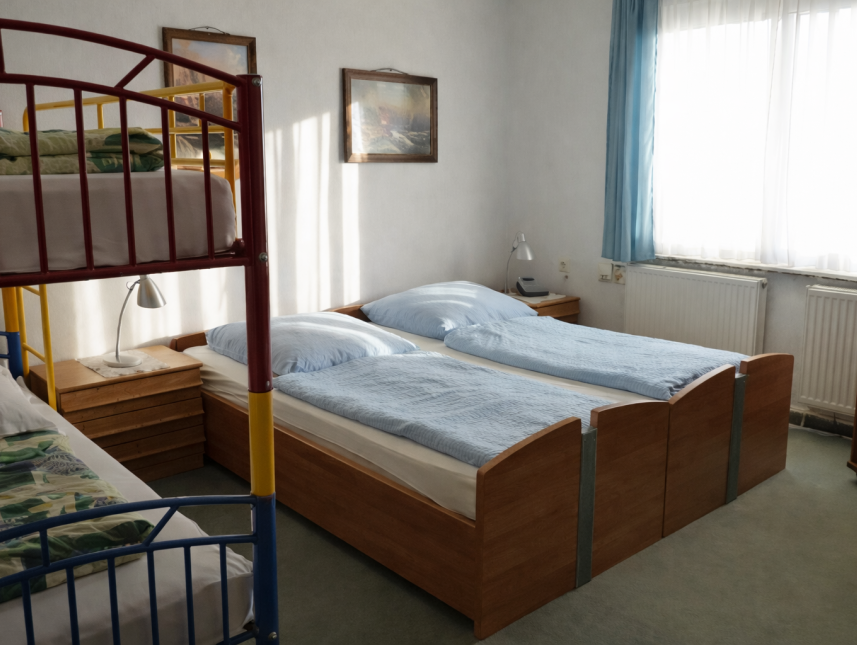 Es gibt 11 Doppel- / Zweibettzimmer, 4 Drei-Bett-Zimmer und 4 Vier-Bettzimmer möglich.