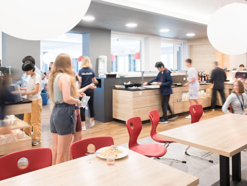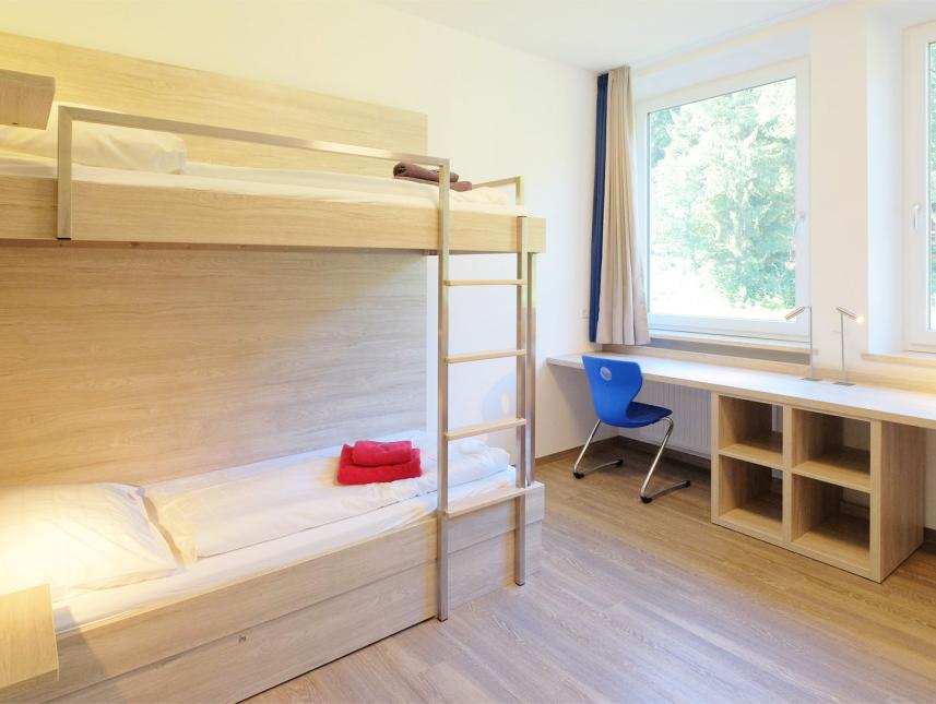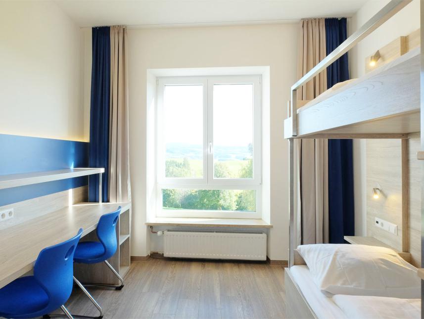 Fast alle Zimmer, in denen die Kinder und Jugendlichen untergebracht werden, haben einen herrlichen Blick auf die Alpen. Die Schüler wohnen vorwiegend in schönen Zweibettzimmern, alle mit eigenem Bad sowie in wenigen Drei- und Vierbettzimmern. Alle Zimmer sind mit hellen, ansprechenden Möbeln ausgestattet. Art der Versorgung: