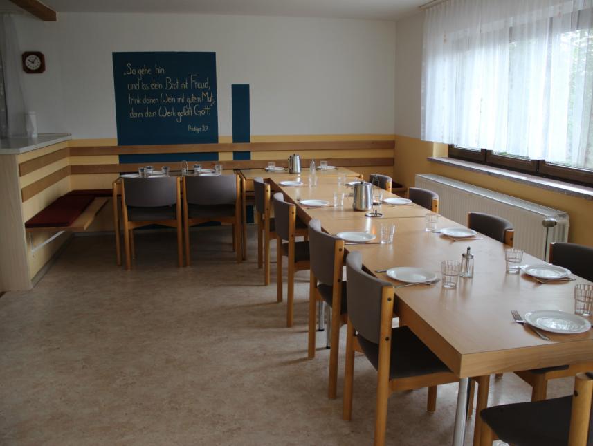 Ein Wegweiser im Foyer des Hauptgebäudes sorgt für Orientierungshilfe und führt Sie zu beiden großen Tagungsräumen, zum Speisesaal mit angrenzender großer Terasse, zur Bibliothek, der Kapelle, der Kellerbar, der Kegelbahn sowie zu den Spielräumen, die mit Kicker, Tischtennisplatte und Billardtisch ausgestattet sind. Auf Wunsch werden die üblichen Moderationsmaterialien sowie Medientechnik zur Verfügung gestellt. Ein Klavier und Gitarren stehen ebenso zur Benutzung bereit.