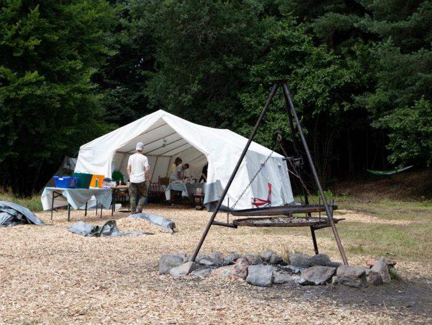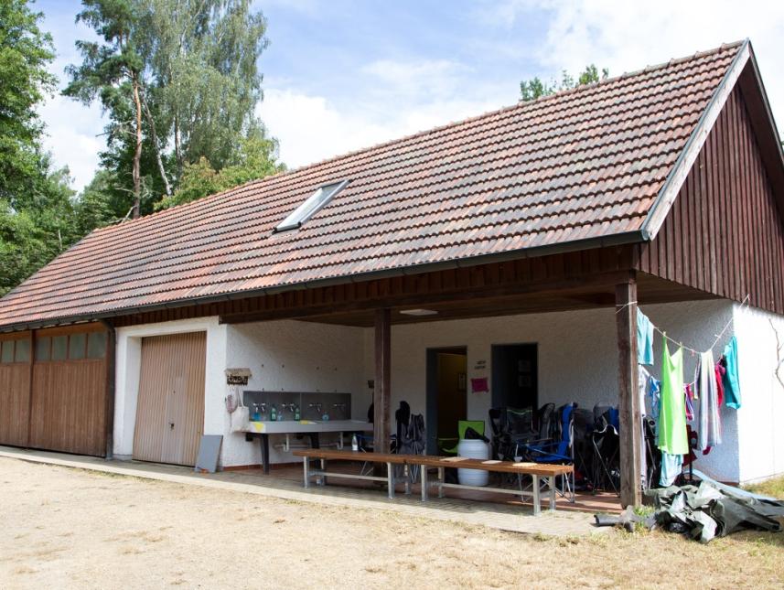 Im Freien befinden sich Zeltplätze für ca. 100 Personen, 1 Feuerplatz mit Schaukelgrill, 1 Reihenwaschanlage (4 Waschplätze), 1 Kaltwasserdusche, 1 Trinkwasserentnahmestelle mit Wassertrog, 1 wetterfeste Tischtennisplatte, 1 Volleyballnetz.