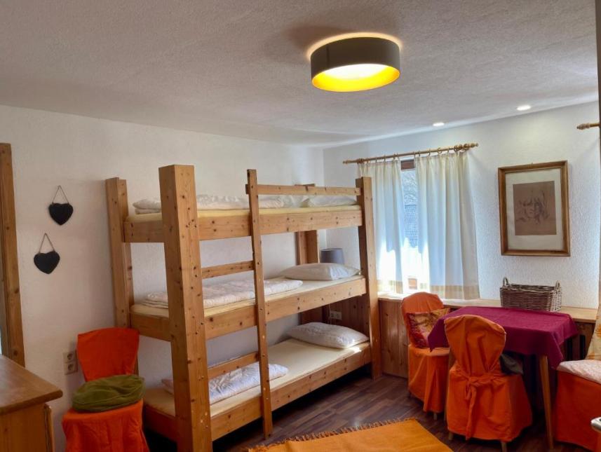 Gemütliche, einfach und robust ausgestattete Unterkunft. Stock- und Einzelbetten. Mitten in einem 7000 m² großen Gartengrundstück, direkt neben unserem Murmeltier 1 gelegen.