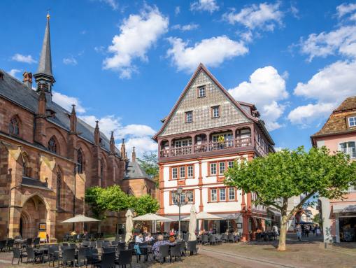 Die historische Altstadt rund um den Marktplatz gehört zu den schönsten der Pfalz. Fachwerkhäuser, kleine Gassen und gemütliche Plätze prägen das Stadtbild. Über der Stadt thront das berühmte Hambacher Schloss – ein bedeutender Ort der deutschen Demokratiegeschichte und gleichzeitig ein Aussichtspunkt mit weitem Blick über die Rheinebene.