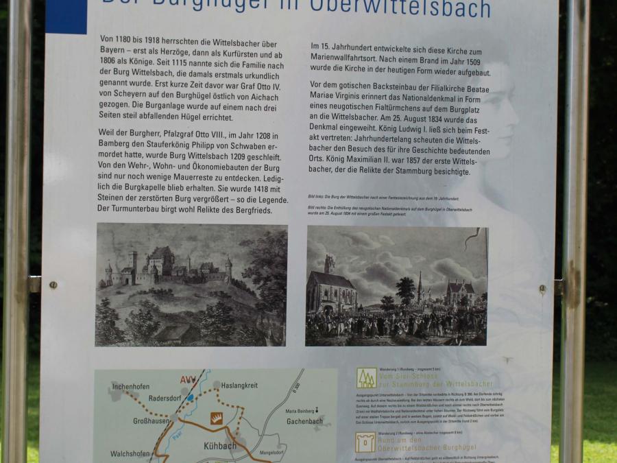 Im Ortsteil Oberwittelsbach findest Du die Burg Wittelsbach, erstmals um 1000 urkundlich erwähnt. Nachdem im Jahre 1209 die Burg zerstört wurde, ist an der Stelle eine Kirche errichtet worden, aus der sich die Ortschaft Oberwittelsbach entwickelt hat, die bis 1978 selbständig war. Im Andenken an die Burg wird der betreffende Teil des Landkreises Aichach-Friedberg als Wittelsbacher Land bezeichnet.
