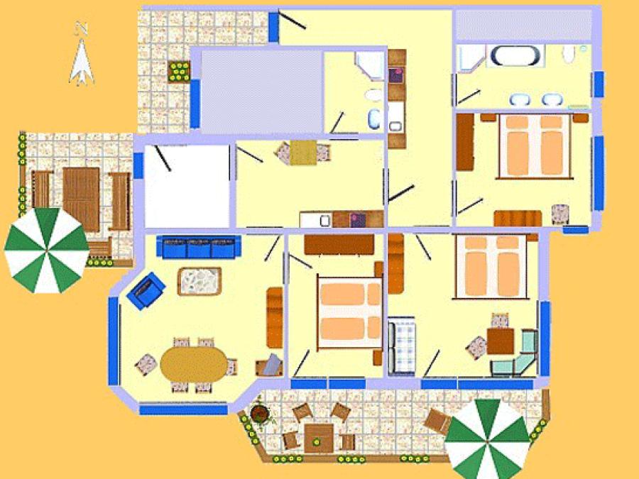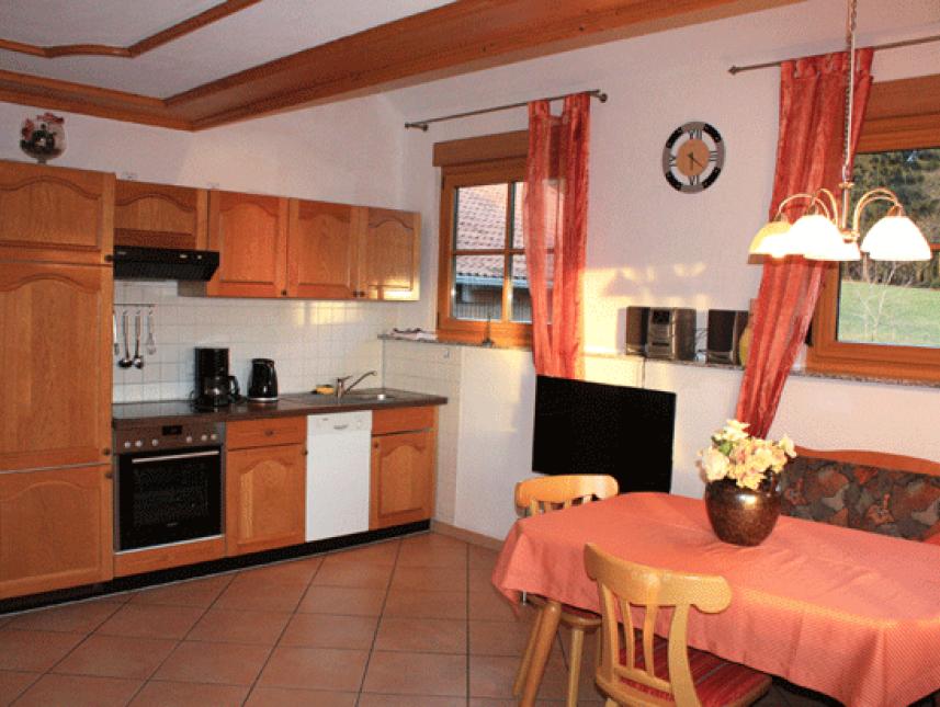 Des weiteren verfügt die Wohnung über zwei Dreibettzimmer und ein Vierbettzimmer, große Küche mit E-Geräten (E-Herd, Backofen, Spülmaschine, Handrührgerät, Toaster, Kaffeemaschine, Elektroquirl). Das Vierbettzimmer hat zusätzlich eine Wohnecke mit Eckbankgruppe. Als weiteres enthält die Wohnung ein großes Bad mit Wanne und Duschbecken extra, Doppelwaschtisch, Haarfön, WC, sowie eine weitere Du/WC. Die Wohnung hat einen schönen Südbalkon. Die ganze Wohnung liegt sonnig und ruhig nach Süden.