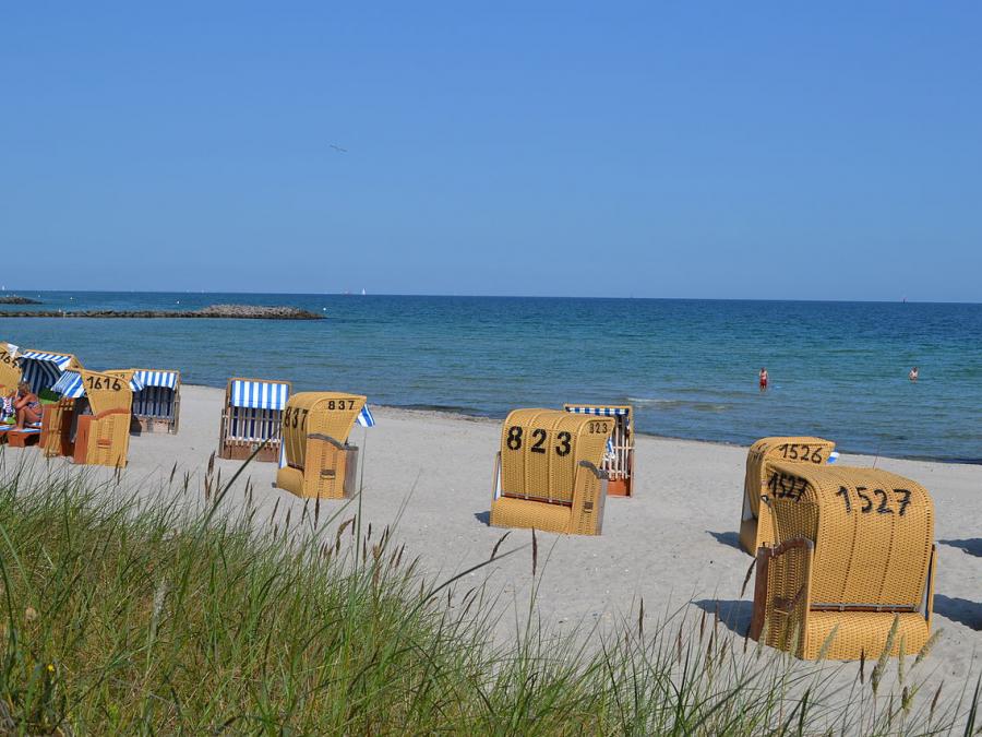 Die Deichterrassen und die Fischerhütten am Schönberger Strand laden zum Verweilen ein, Strandkörbe (Mai bis September) bieten Entspannung.