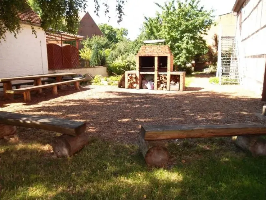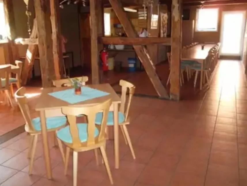 Große Fachwerk-Ökoscheune mit Lehmdämmung. Angenehmes Wohlfühlklima. Großzügige Räume und Sanitäranlagen. Große Diele im EG, deneben Essensraum. Unmittelbar benachbart mit eigenem Eingang Tischtennis-Raum mit 2 Platten und Holzwerkstatt mit Kicker etc..