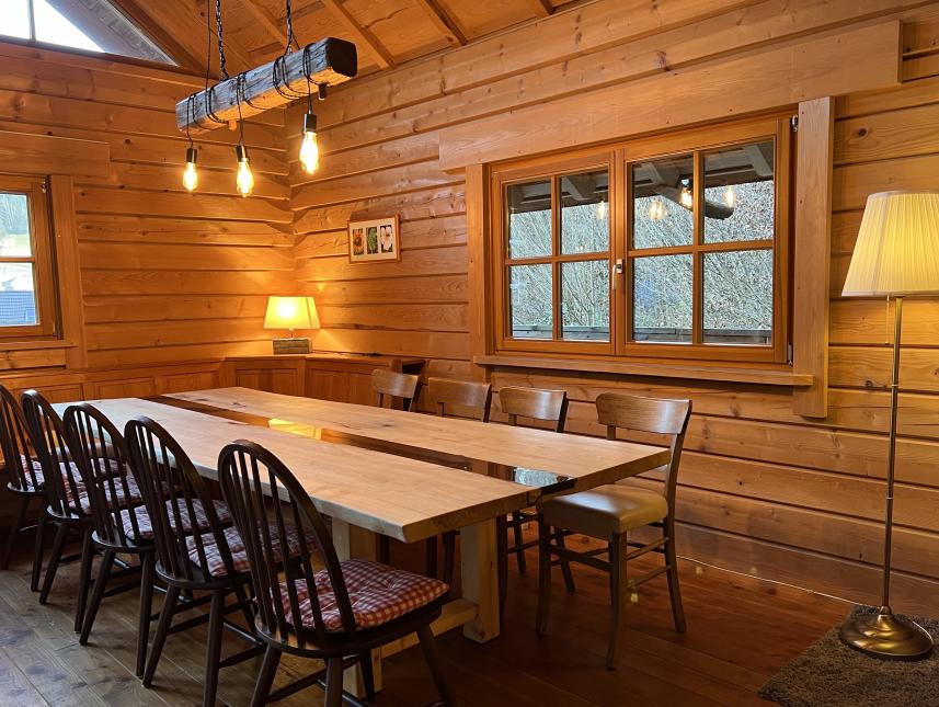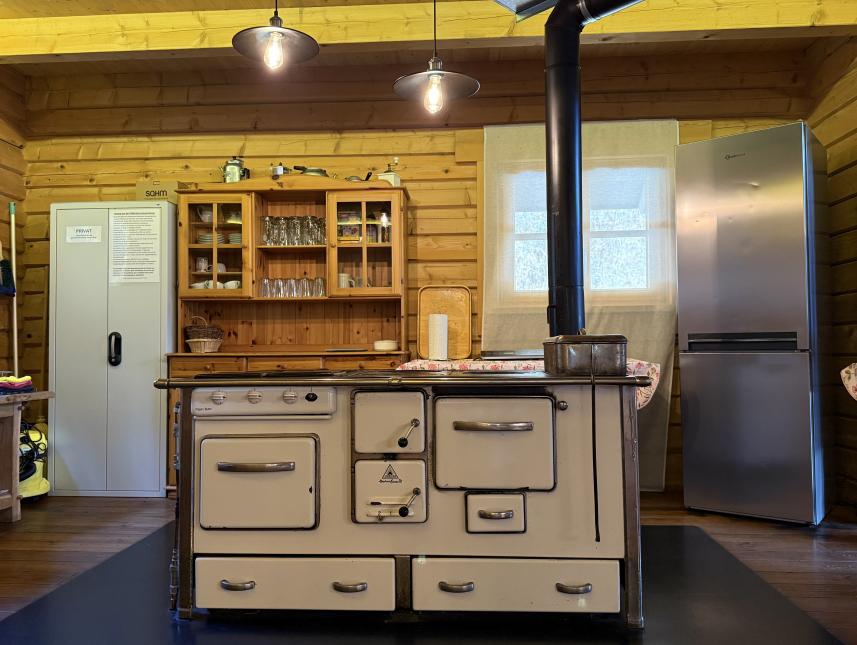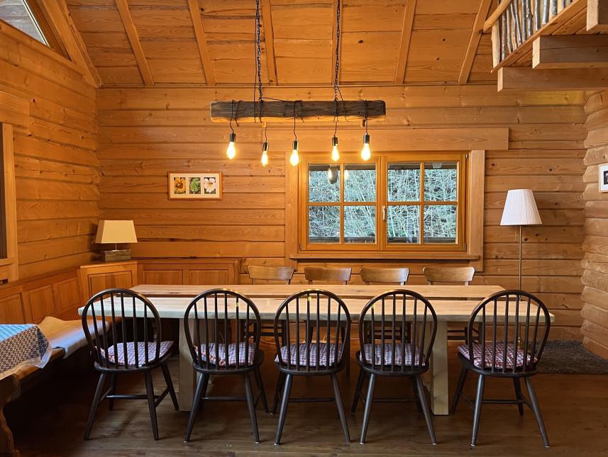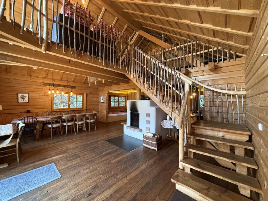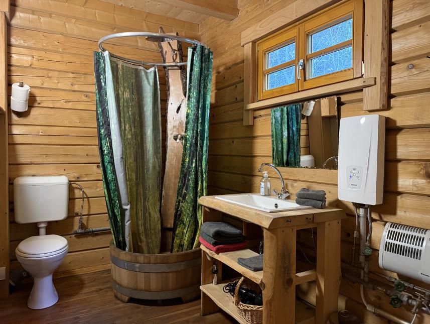 Im Erdgeschoss bildet ein großer Grundofen das zentrale Element und sorgt für angenehme Wärme. Auf der linken Seite direkt neben dem Ofen befindet sich der Essbereich mit einem hochwertigen Massivholztisch, bequemen Stühlen und einer stimmungsvollen Beleuchtung. Der Küchenbereich ist vollständig ausgestattet und bietet neben einem traditionellen Holzherd auch eine moderne Induktionsplatte, eine Filterkaffeemaschine, einen geräumigen Kühlschrank mit Gefrierfach sowie diverses Koch- und Essgeschirr. Neben dem Küchenbereich befindet sich das Badezimmer, welche zugleich die einzige abzuschließende Räumlichkeit ist. Diese ist ausgestattet mit der besonderen Holzzuber-Dusche, einer Toilette und einem Waschbecken.