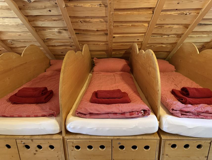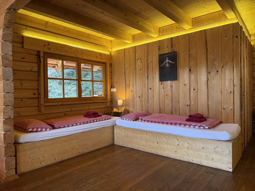 10 gemütliche Schlafplätze in zwei gegenüberliegenden 5er-Bettbox-Reihen, durch hölzerne „Wolkentrenner“ vollständig abgetrennt, 2x Bettboxen im Erdgeschoss