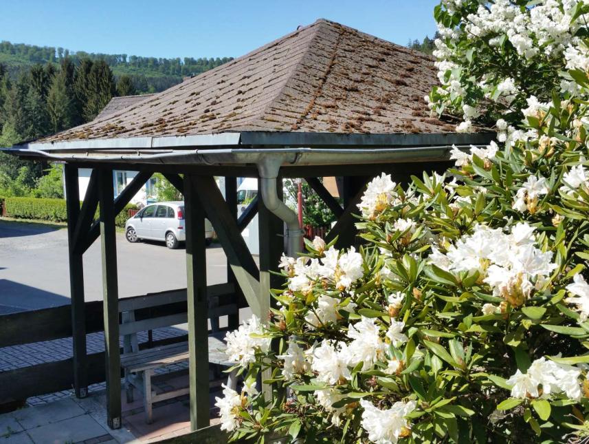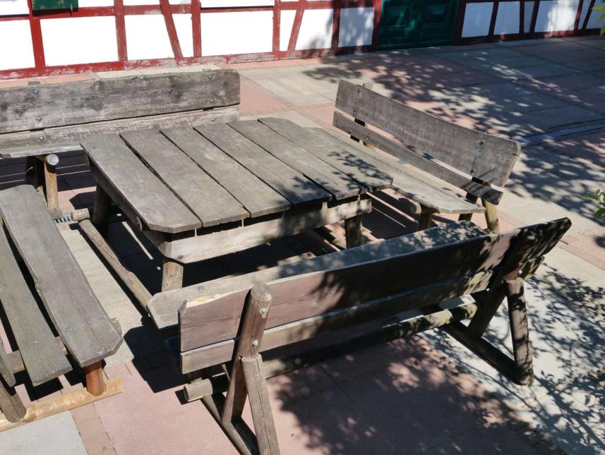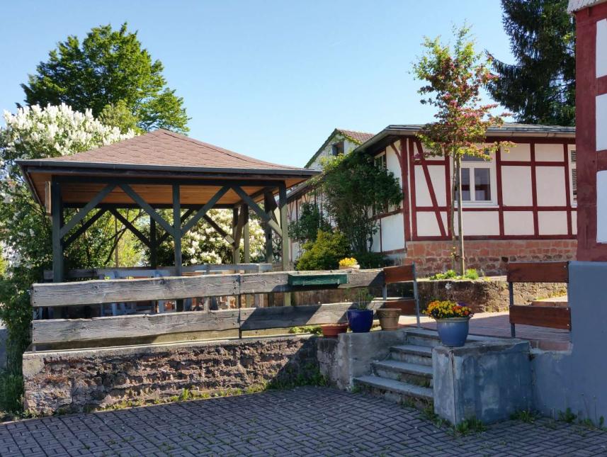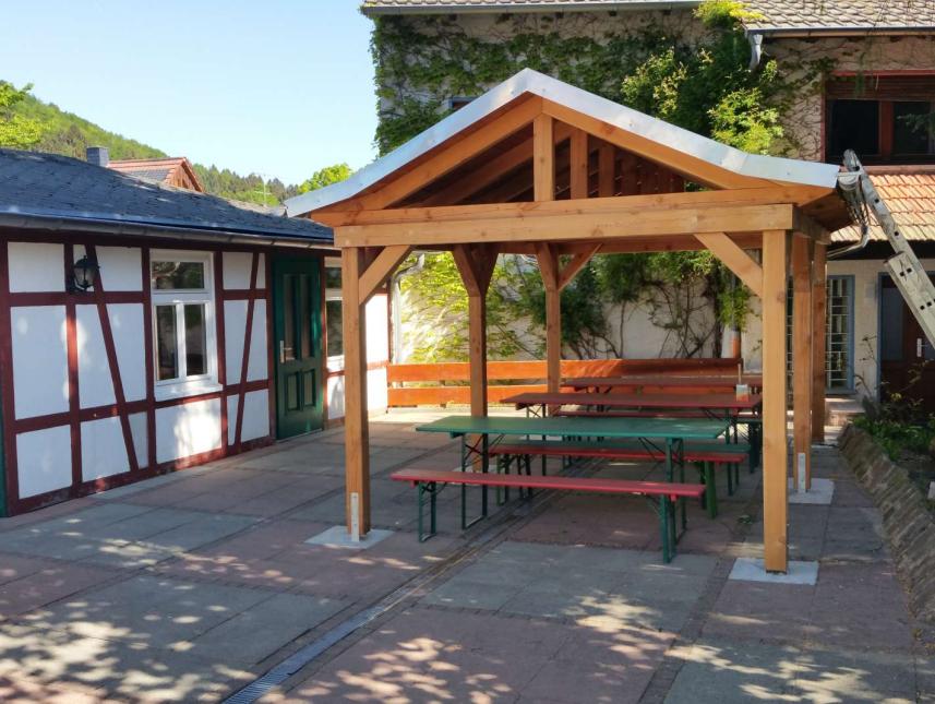 Den Gruppen steht eine große Spielwiese mit Lagerfeuerplatz sowie einem regengeschützten Innenhof mit Holzpavillon zur Verfügung. Dieser Hof eignet sich bei schönem Wetter auch als Essplatz. Mehrere Tische und Bänke sind dort aufgestellt.