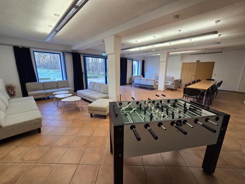 Gemütlicher Raum mit bequemen Couches, großen Fenstern mit Blick ins Grüne und einer entspannten Atmosphäre – perfekt zum Ausruhen, Austauschen und gemeinsamen Beisammensein. 🌿☕