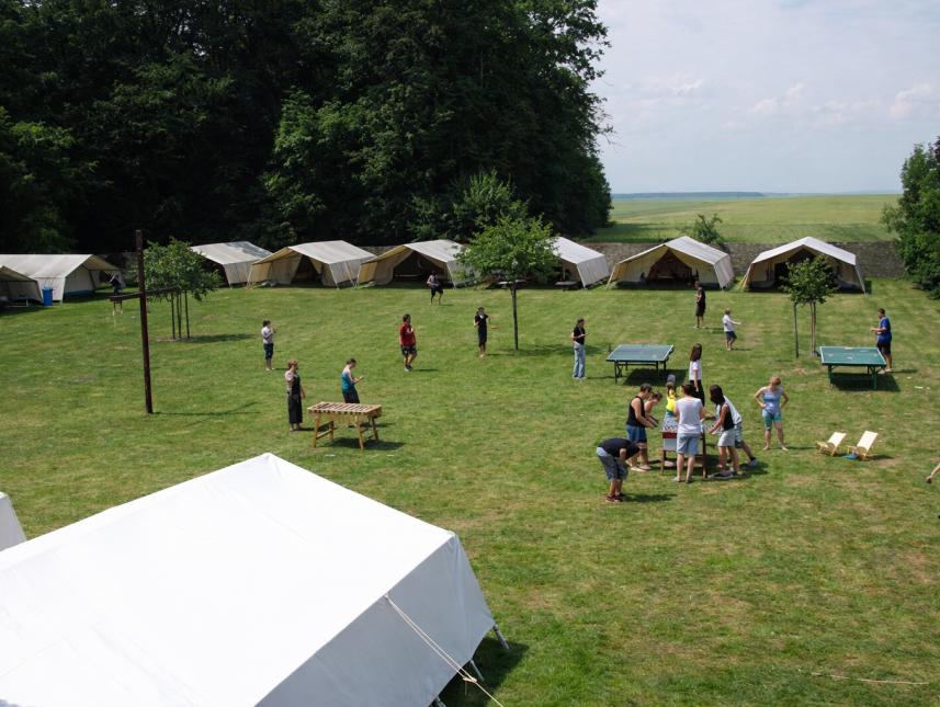 Der ca. 3.000 m² große Zeltplatz ist von einer Mauer umschlossen. Während der Sommermonate stehen dort Gruppenzelte (10 Personen) – ausgestattet mit Feldbetten auf Holzböden. Die Maximalbelegung liegt bei 120 Personen, die Mindestbelegung bei 60 Personen.