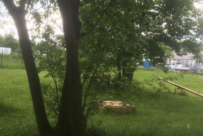 Große Küche, Tischkicker, schöne Außenanlage. Pflegebetten und -bad in Wohnung 1.