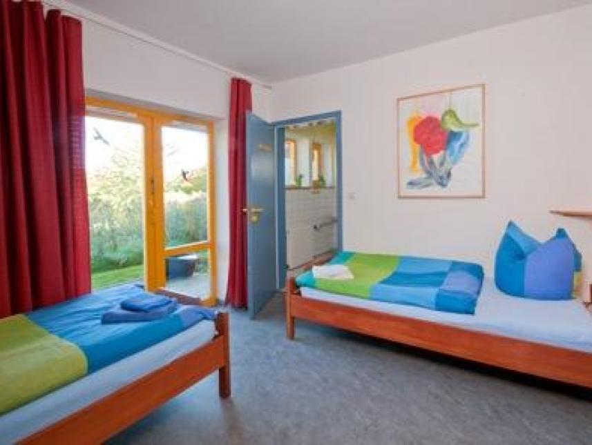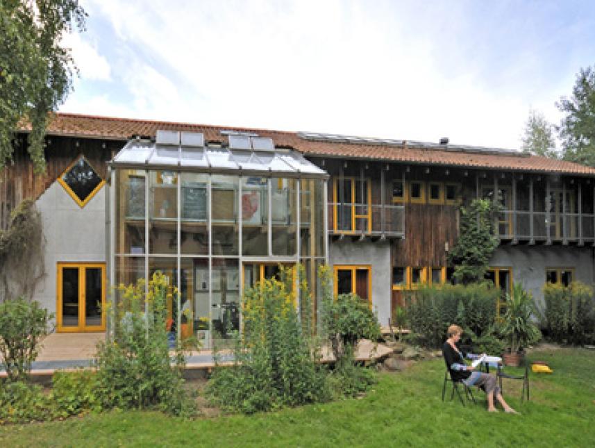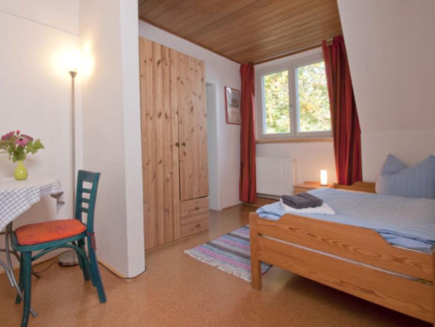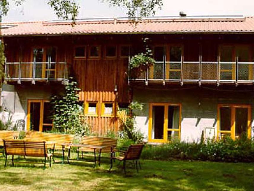 Seit 1992 kann man ökologisches Wohnen im Niedrig- Energie- Gästehaus erleben. Die Zwei- und Drei- Bett- Zimmer für insgesamt 32 Gäste haben jeweils eine eigene Dusche, WC, Balkon oder Terasse. Ein Doppelzimmer ist rollstuhlgerecht ausgestattet.