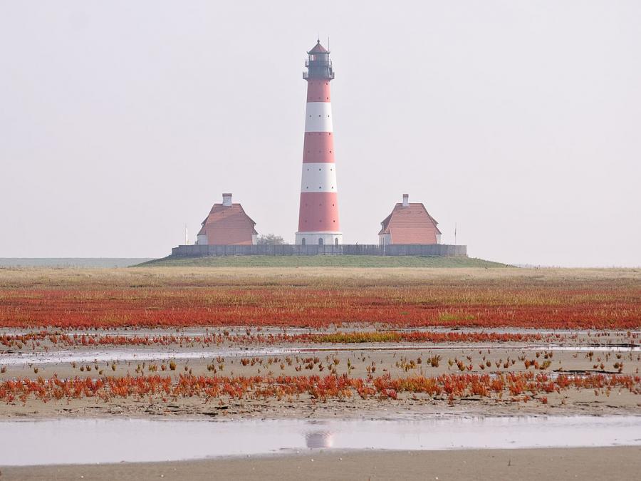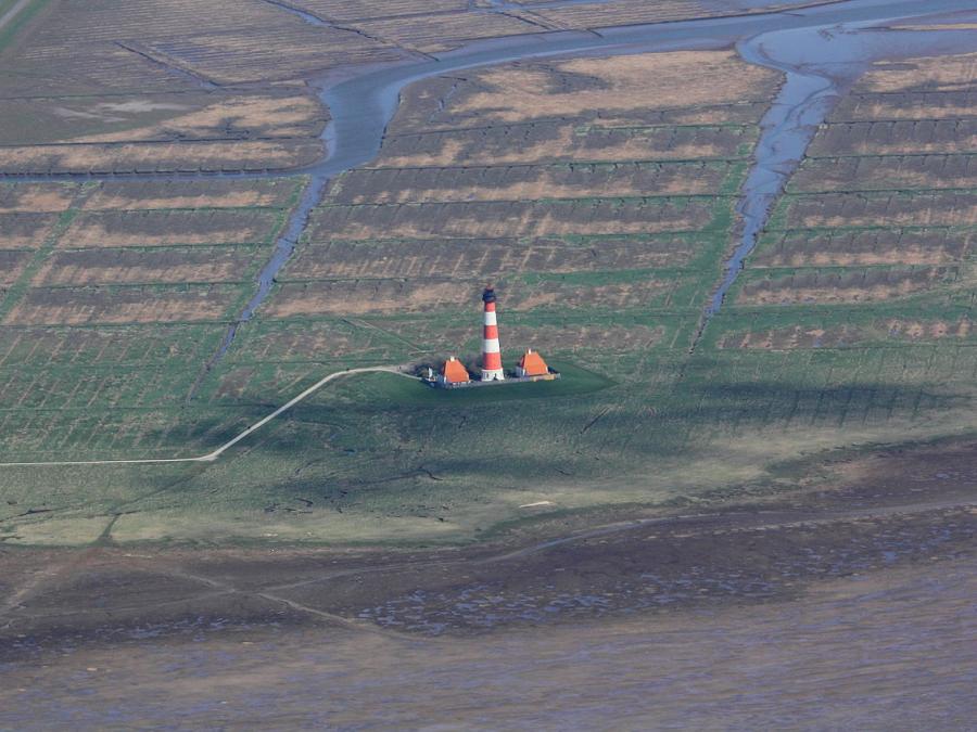 Westerhever liegt irgendwie am Ende der Welt, das Land hört auf, das Meer beginnt, dazwischen schützendes Deichwerk, von Schafen begräst. Ein paar Häuser sind über mächtig ausgedehntes Grünland verstreut. Ein berühmter Leuchtturm wie zum Festhalten. Ein trutziger Kirchturm, wie gemauert aus Jahrhunderten alten Geschichten von Liebe und Tod, von Sturmflutangst und Räuberabwehr. Um den Überblick zu erlangen, müsste man fliegen können, fliegen wie die Zugvögel, die zweimal im Jahr unsere Halbinsel und die benachbarten Halligen besonders zu schätzen wissen als nahrhafte Zwischenstopps. Denn Westerhever, das sich am stillen Ende der Halbinsel Eiderstedt ausbreitet, ragt ins Wattenmeer hinaus, ins weithin gerühmte Unesco Weltnaturerbegebiet. Hier regiert die Natur sich selber, die Salzwasserfluten kommen und gehen im kosmischen Rhythmus der Gezeiten [...]